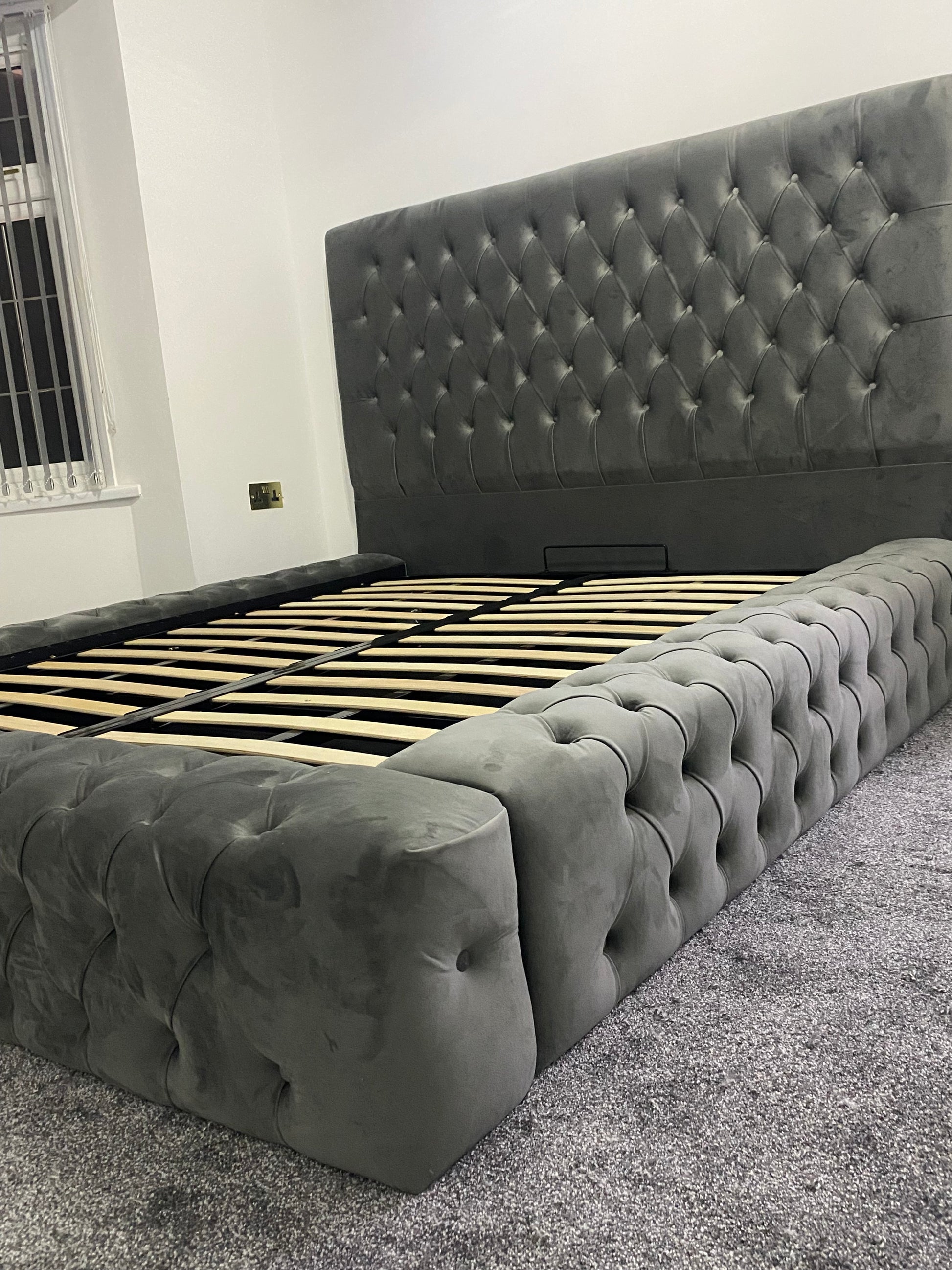 Main picture shows grey plush velvet with matching buttons and Ottoman Gaslift Storage.