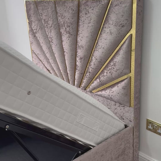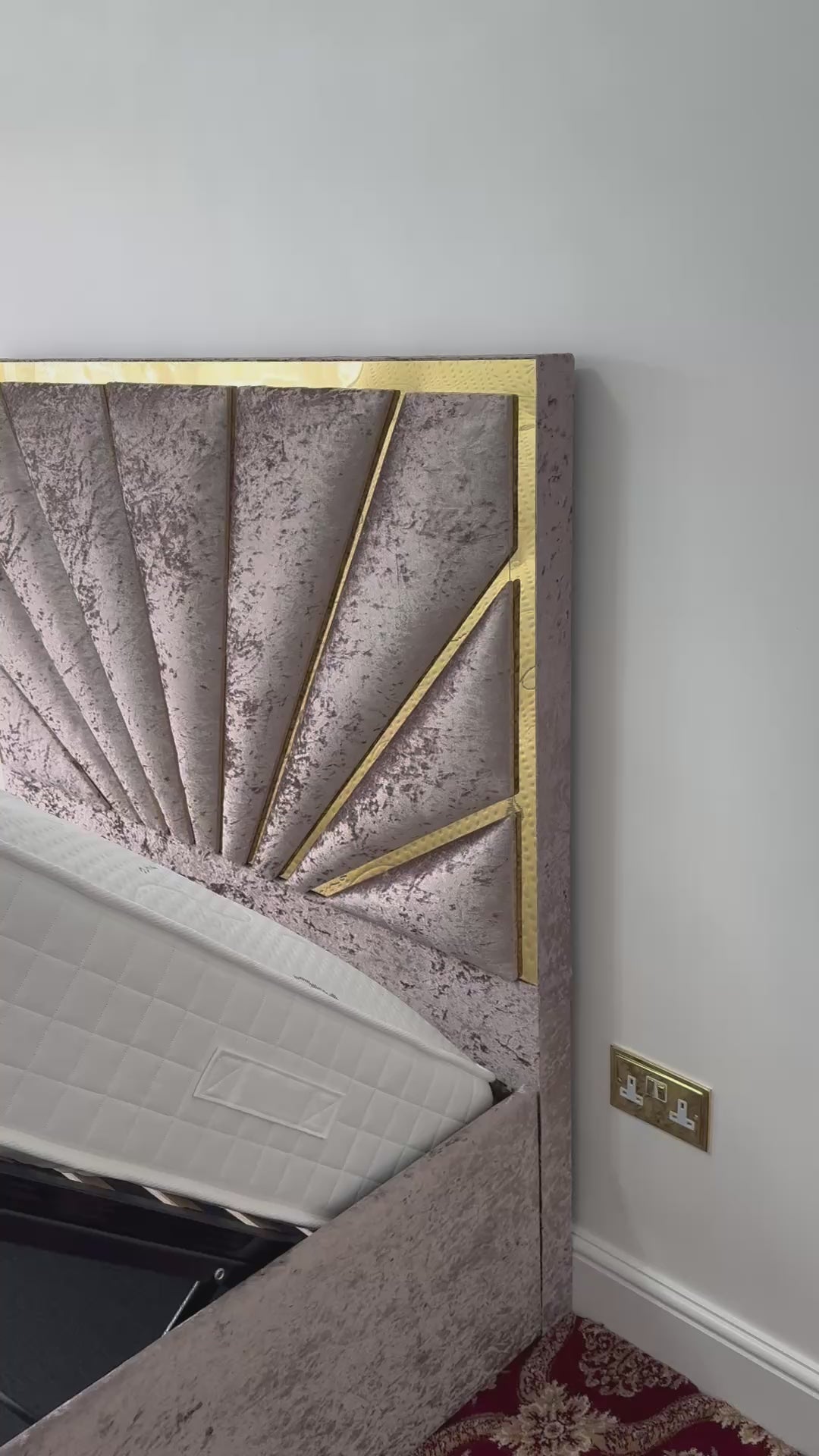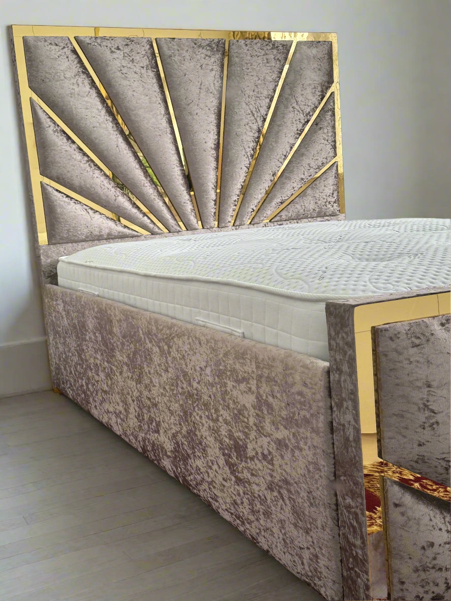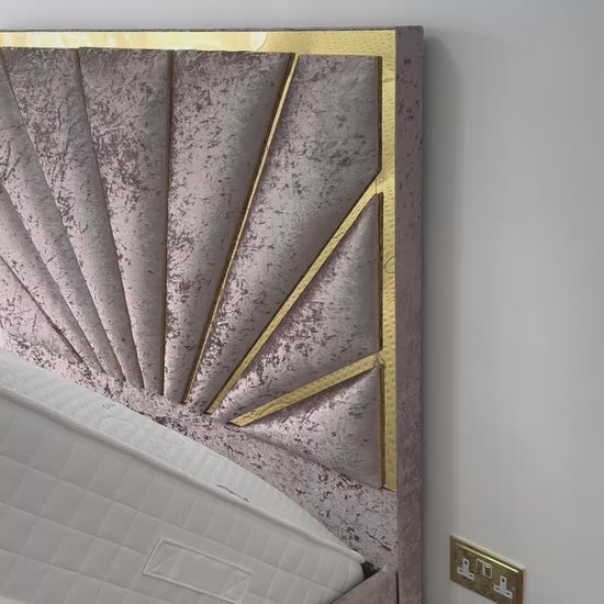 Introducing the Geneva Sunrise Bed - a stunning, handcrafted masterpiece with intricate gold detailing. Each panel is individually upholstered and thoughtfully placed, resulting in unparalleled quality and a flawless, finished look. Trust the experts at Halo Furnishing to deliver the best in luxury and craftsmanship.