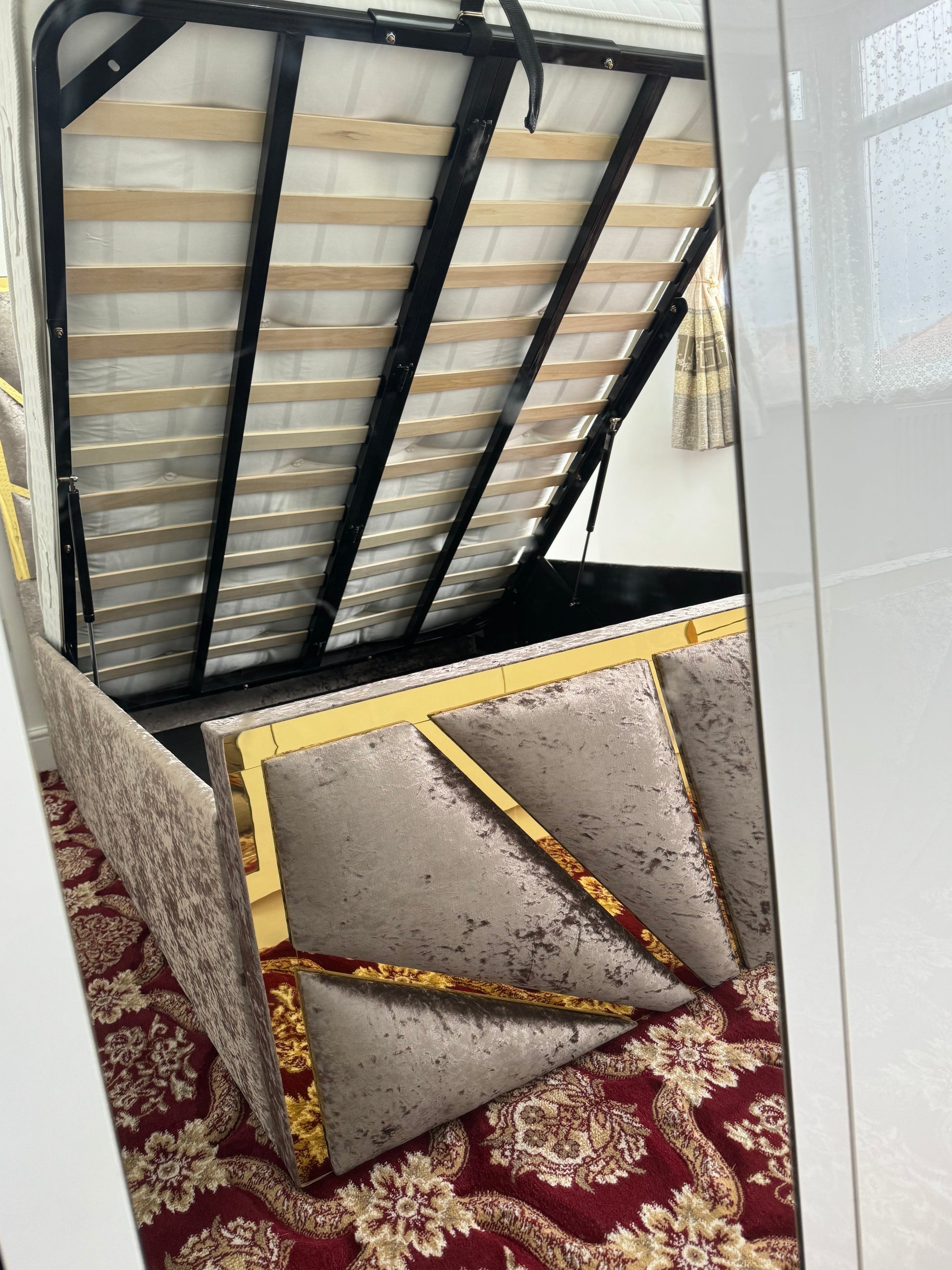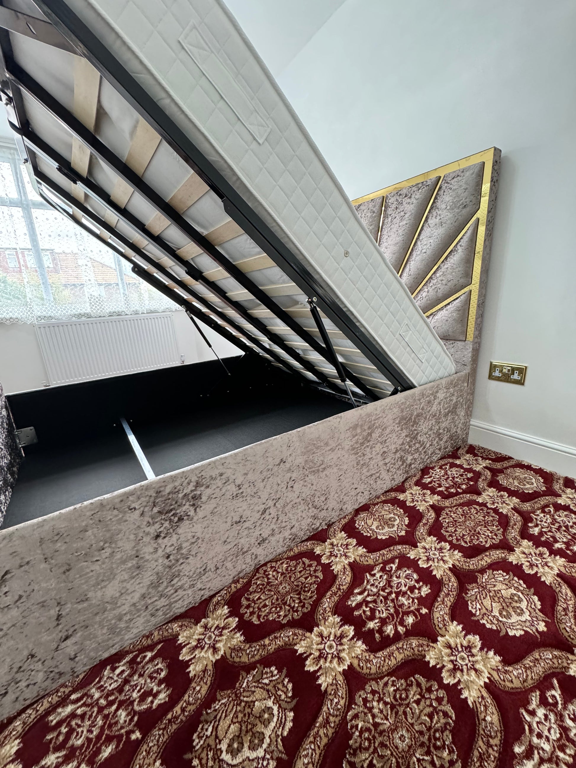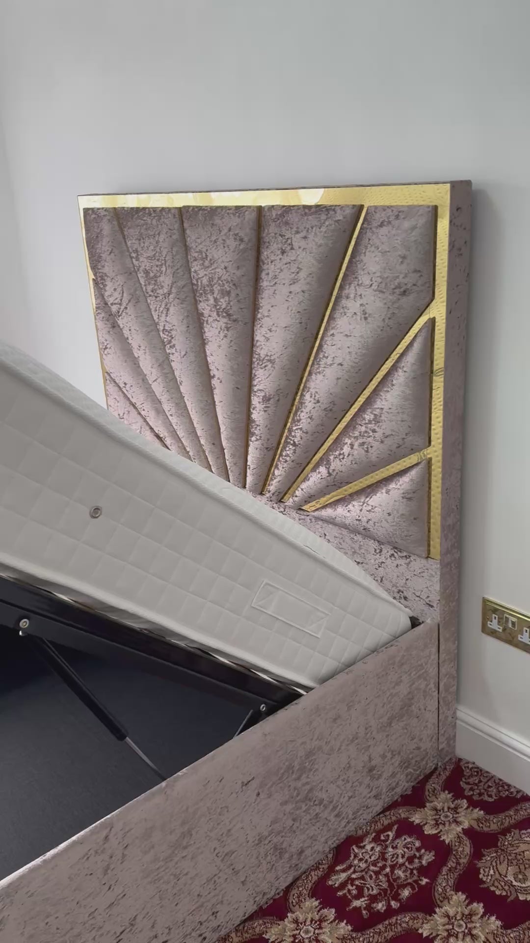 Introducing the Geneva Sunrise Bed - a stunning, handcrafted masterpiece with intricate gold detailing. Each panel is individually upholstered and thoughtfully placed, resulting in unparalleled quality and a flawless, finished look. Trust the experts at Halo Furnishing to deliver the best in luxury and craftsmanship.