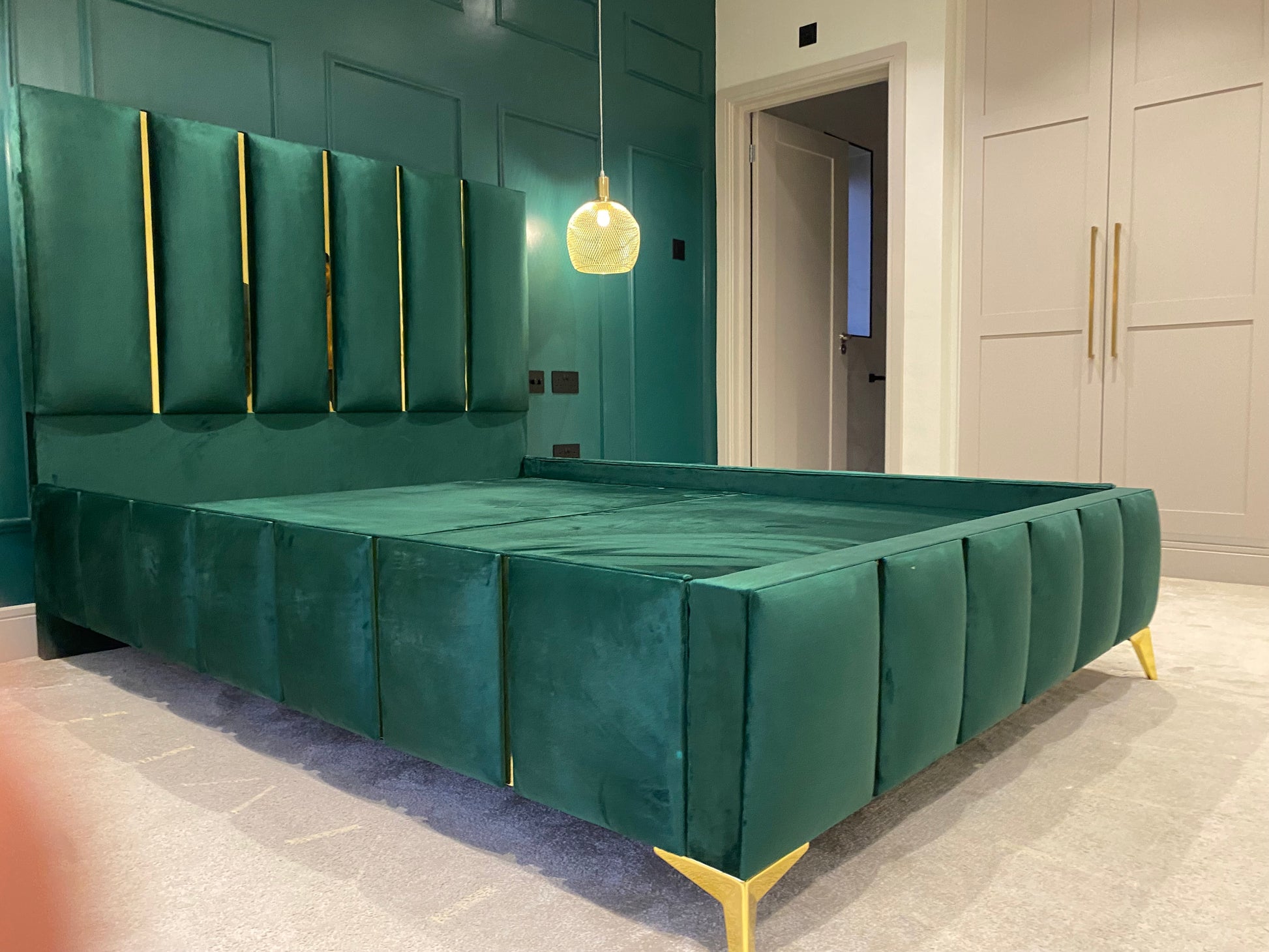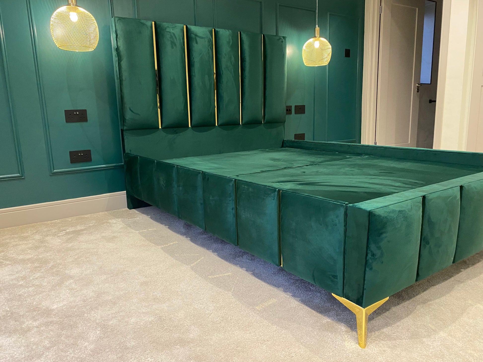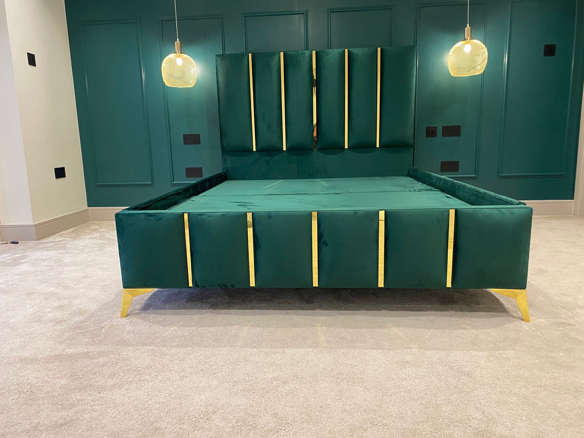 Introducing our Luxury Gold Striped Bed - a truly opulent addition to your bedroom. This striking panel bed is handcrafted using only the highest quality materials, ensuring both durability and comfort.