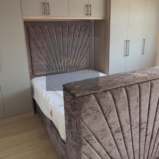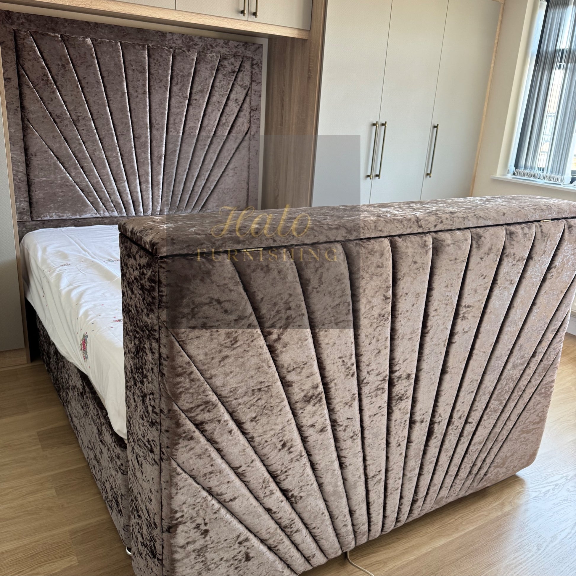The Sunrise TV Bed transforms your bedroom into a personal entertainment haven. Designed to accommodate televisions up to 47 inches, this bed features a convenient remote control system that smoothly raises and lowers your TV. For added convenience, connect through our user-friendly app for smartphone control. We understand everyone's style is unique, which is why we offer full customization options—choose your perfect fabric, color, and headboard height to create the bedroom sanctuary you've always wanted.